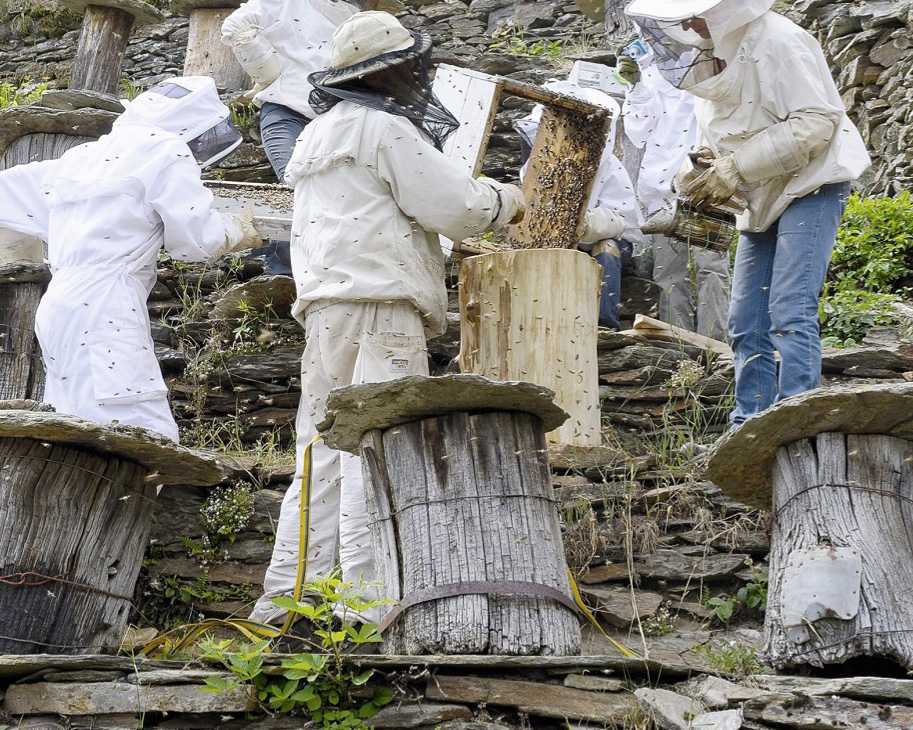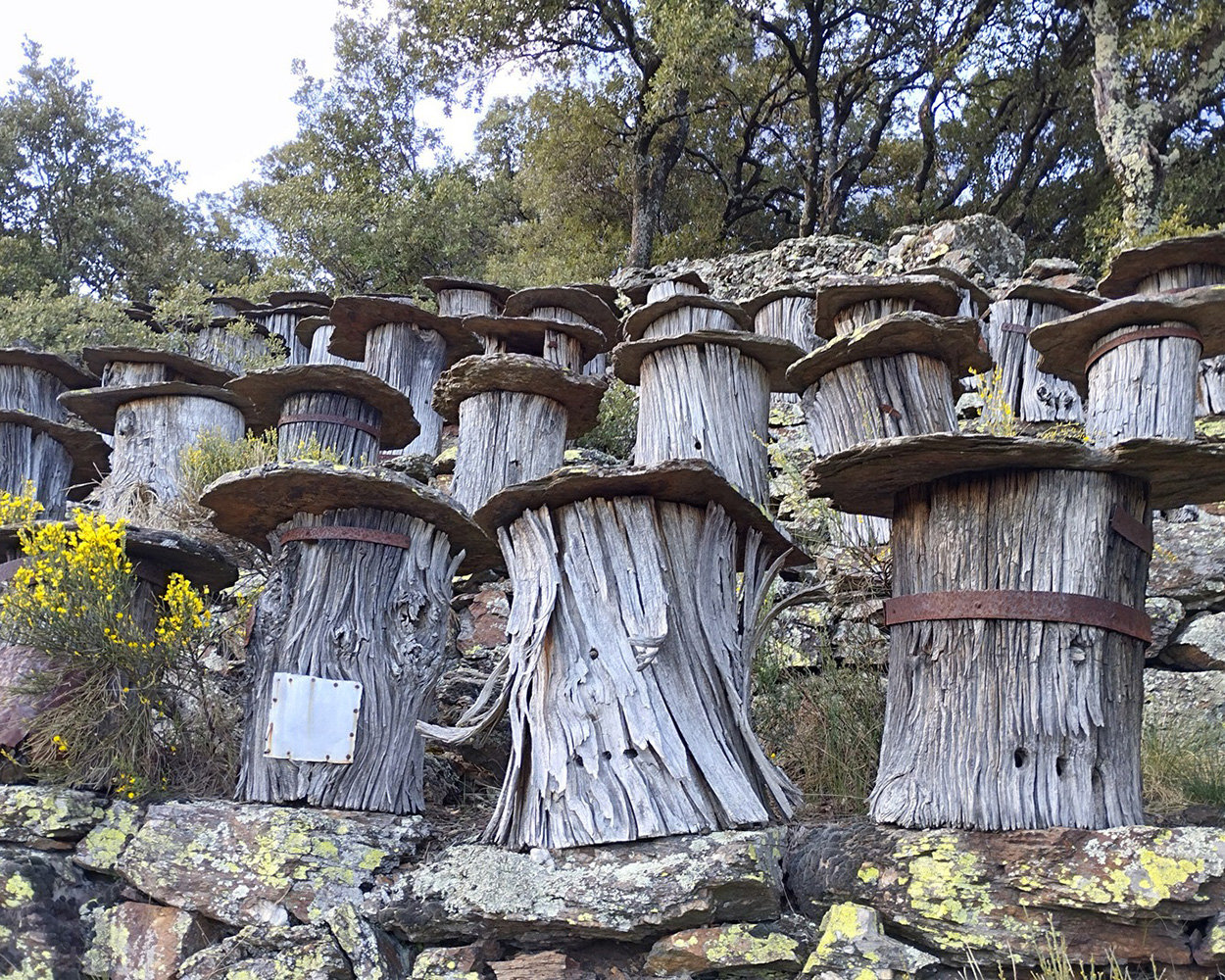La ruche-tronc, ou brusc. Creusée dans un tronc de châtaignier et coiffée d’une lauze (dalle de schiste), elle s’inspire directement du lieu de nidification naturel des abeilles. Plus qu’un simple habitat, c’est un modèle de durabilité : les tanins du châtaignier le rendent imputrescible et capable de durer des siècles, offrant aux apiculteurs de l’époque un système respectueux de l’environnement et des colonies.