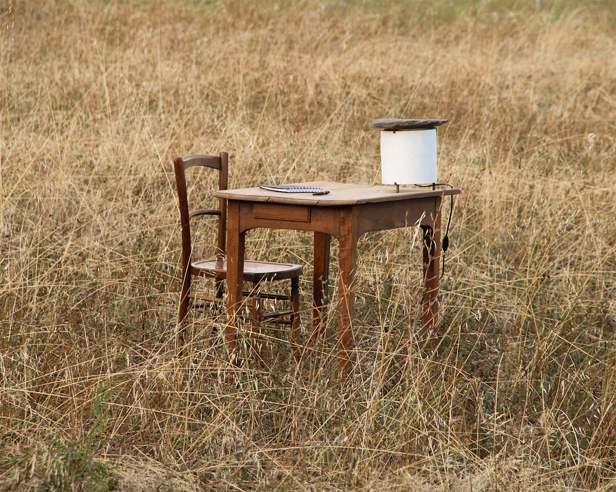 Le projet est basé sur un jeu de contrastes : la lauze en pierre, symbole de stabilité et d’ancrage local, sert de couvercle, tandis que le volume protecteur du tronc de châtaignier est remplacé par un rouleau de papier soutenu par une structure métallique minimaliste.