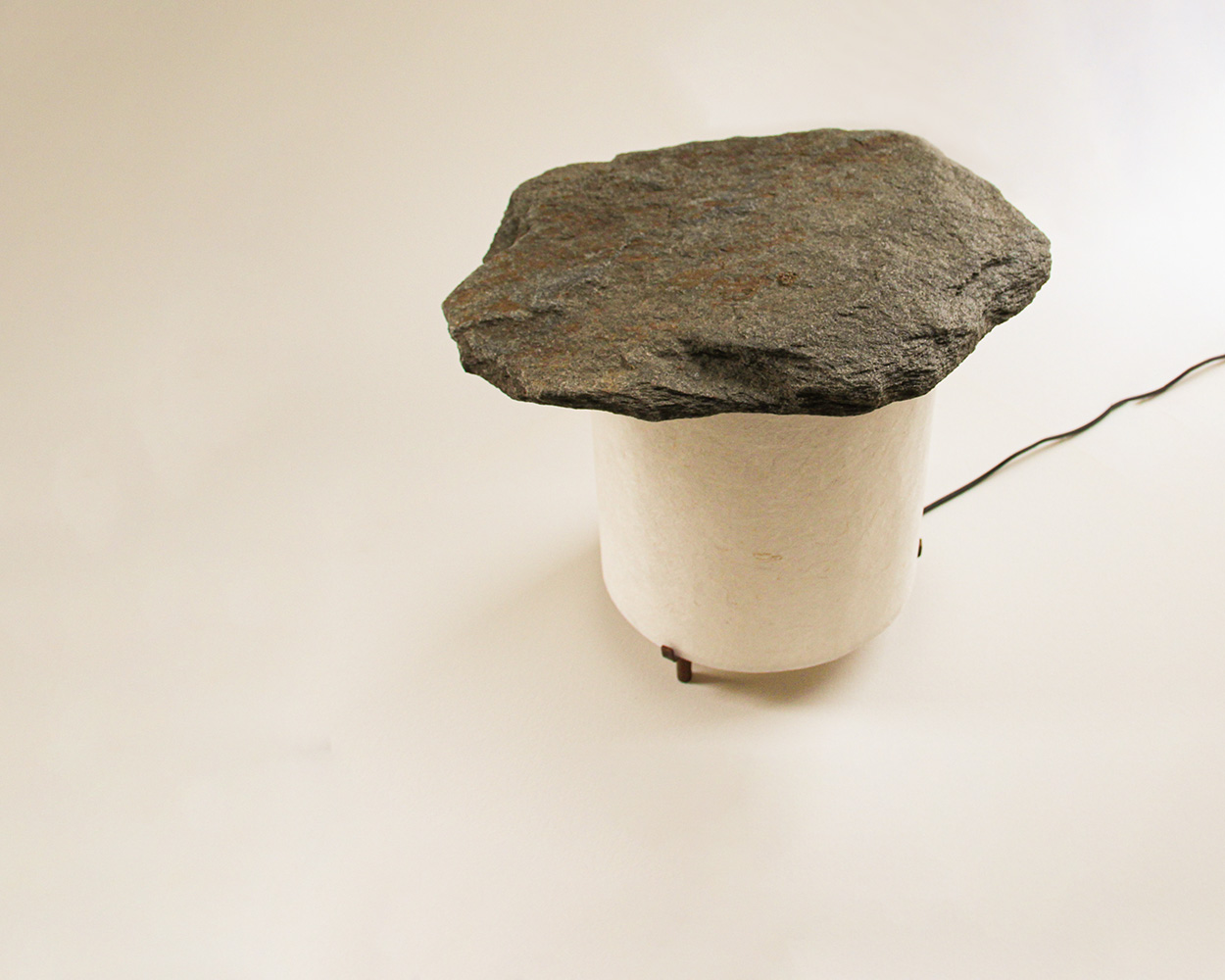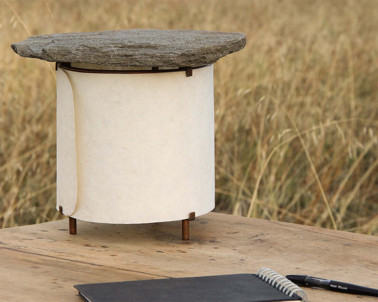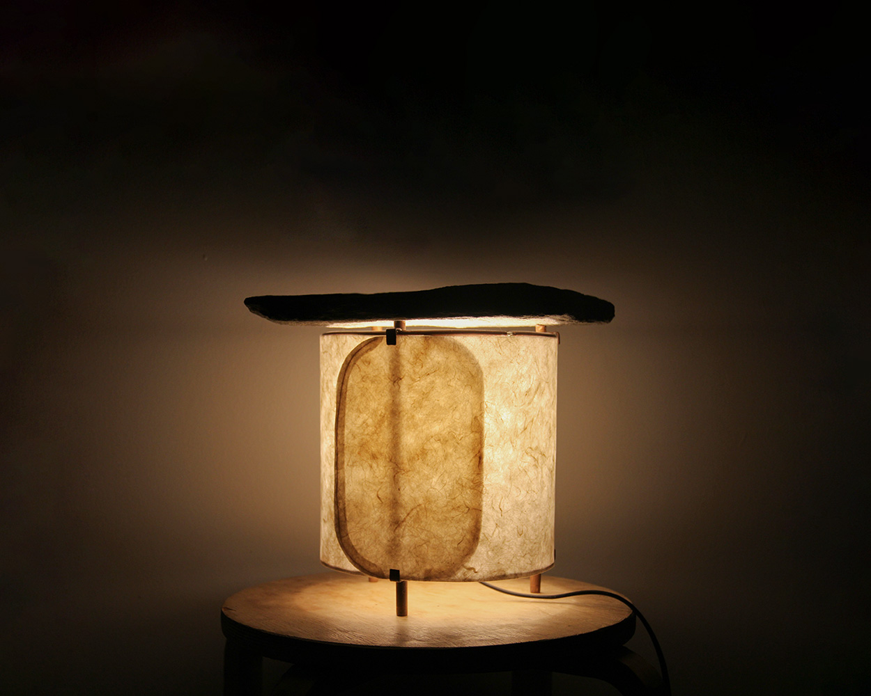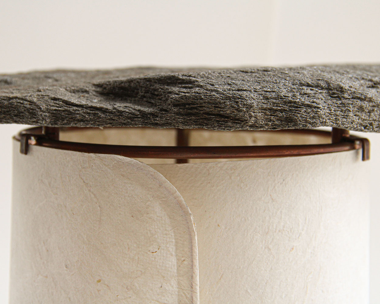 Avec la lampe Buc, mon ambition était de proposer un objet brut et poétique qui résonne avec le paysage ardéchois. J’ai cherché à capturer l’essence minérale et végétale de cette région : la lauze en pierre rappelle les sols et les toitures, tandis que le papier, par sa texture et sa lumière douce, évoque la chaleur du bois et le travail des matières naturelles.